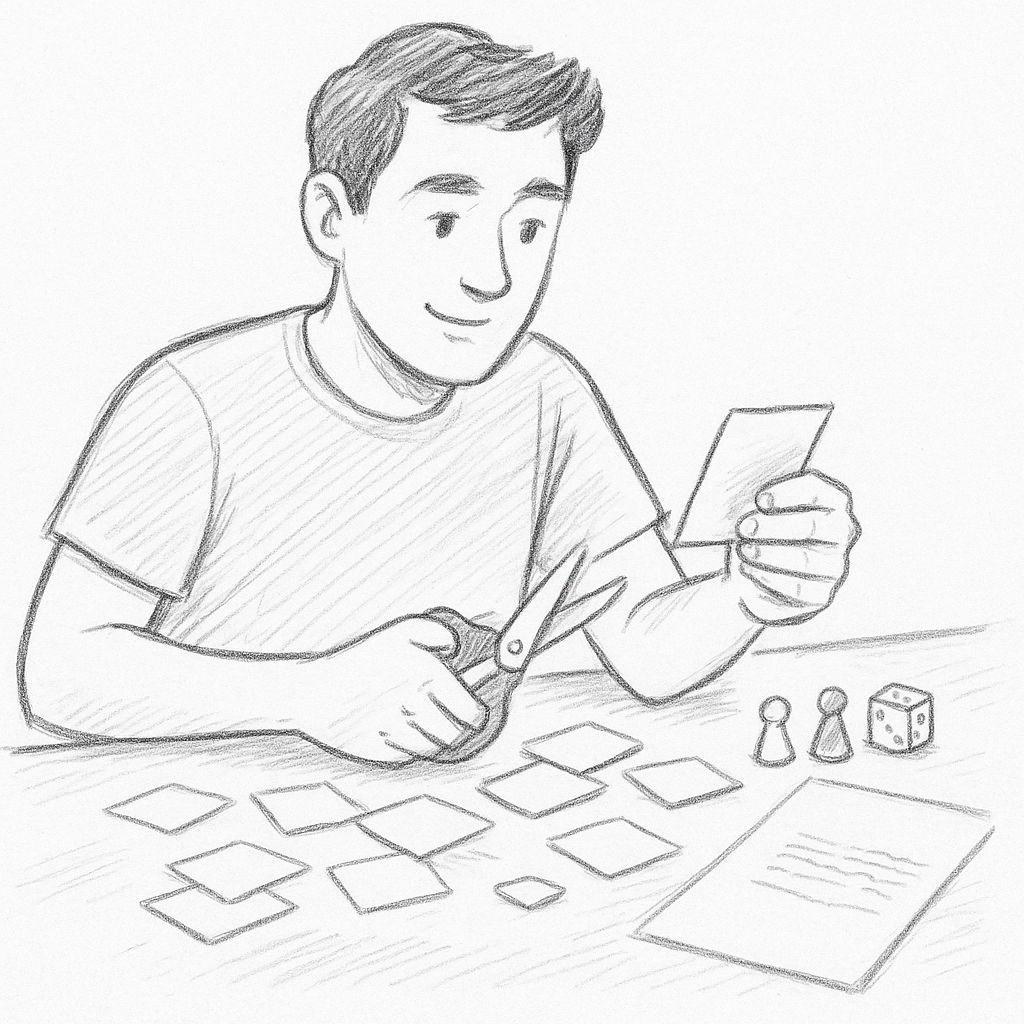 Rapidement, l’auteur imagine un prototype – souvent fait de cartons découpés, de pions improvisés et de règles encore en construction.